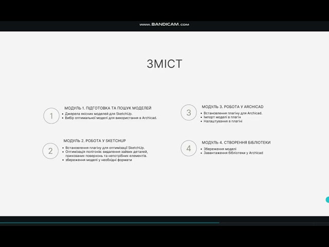 У процесі навчання ти дізнаєшся, як встановлювати потрібні плагіни, редагувати ступінь деталізації та оптимізувати полігони. Ти зможеш змінювати розміри, параметри й текстури, а також налаштовувати акуратні 2D-символи, які виглядатимуть професійно на планах та розгортках.